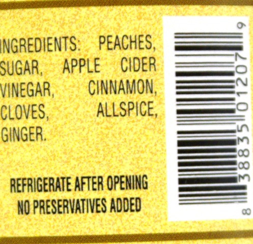 Ingredients: Peaches, sugar, apple cider vinegar, cinnamon, cloves, allspice, ginger